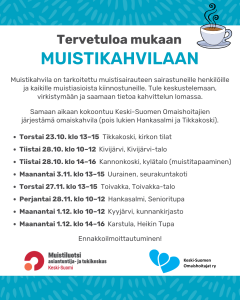 Tervetuloa mukaan muistikahviloihin! Tule keskustelemaan, virkistymään ja saamaan tietoa kahvittelun lomassa. Muistikahvila on tarkoitettu muistisairauteen…