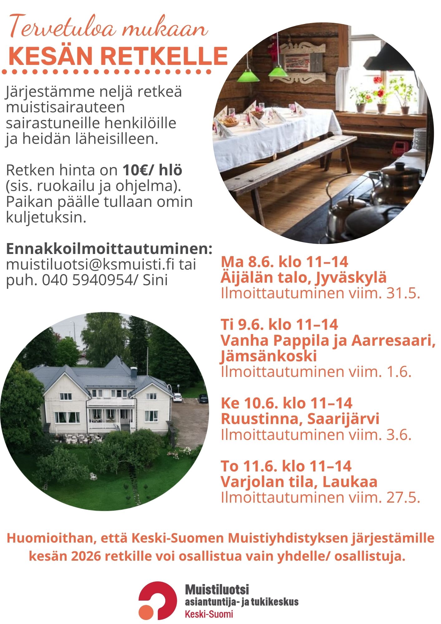 Huomioithan, että Keski-Suomen Muistiyhdistyksen järjestämille kesän 2026 retkille voi osallistua vain yhdelle/ osallistuja.