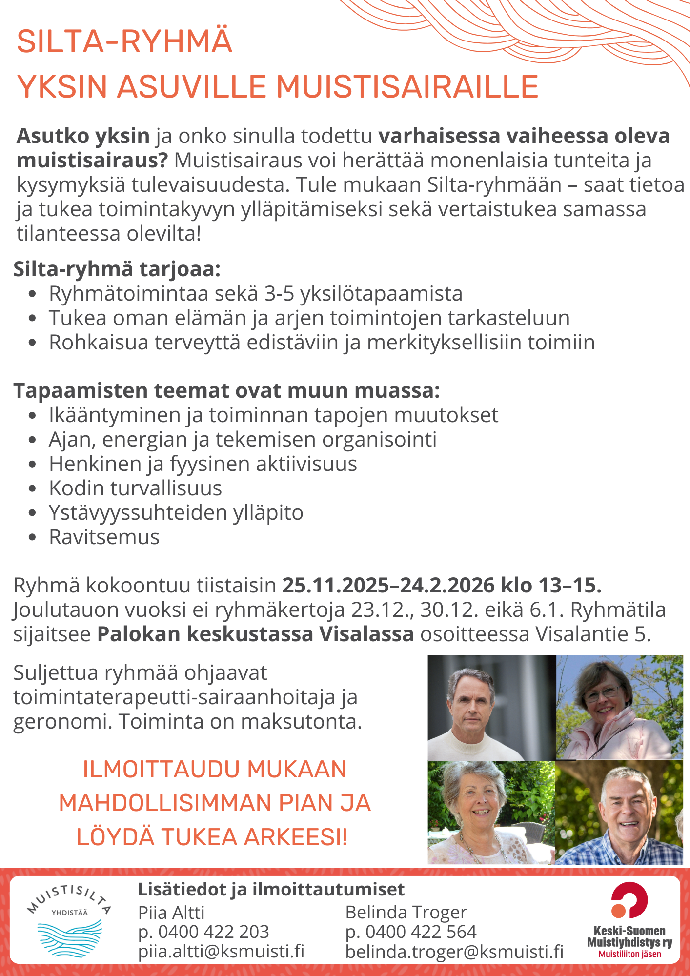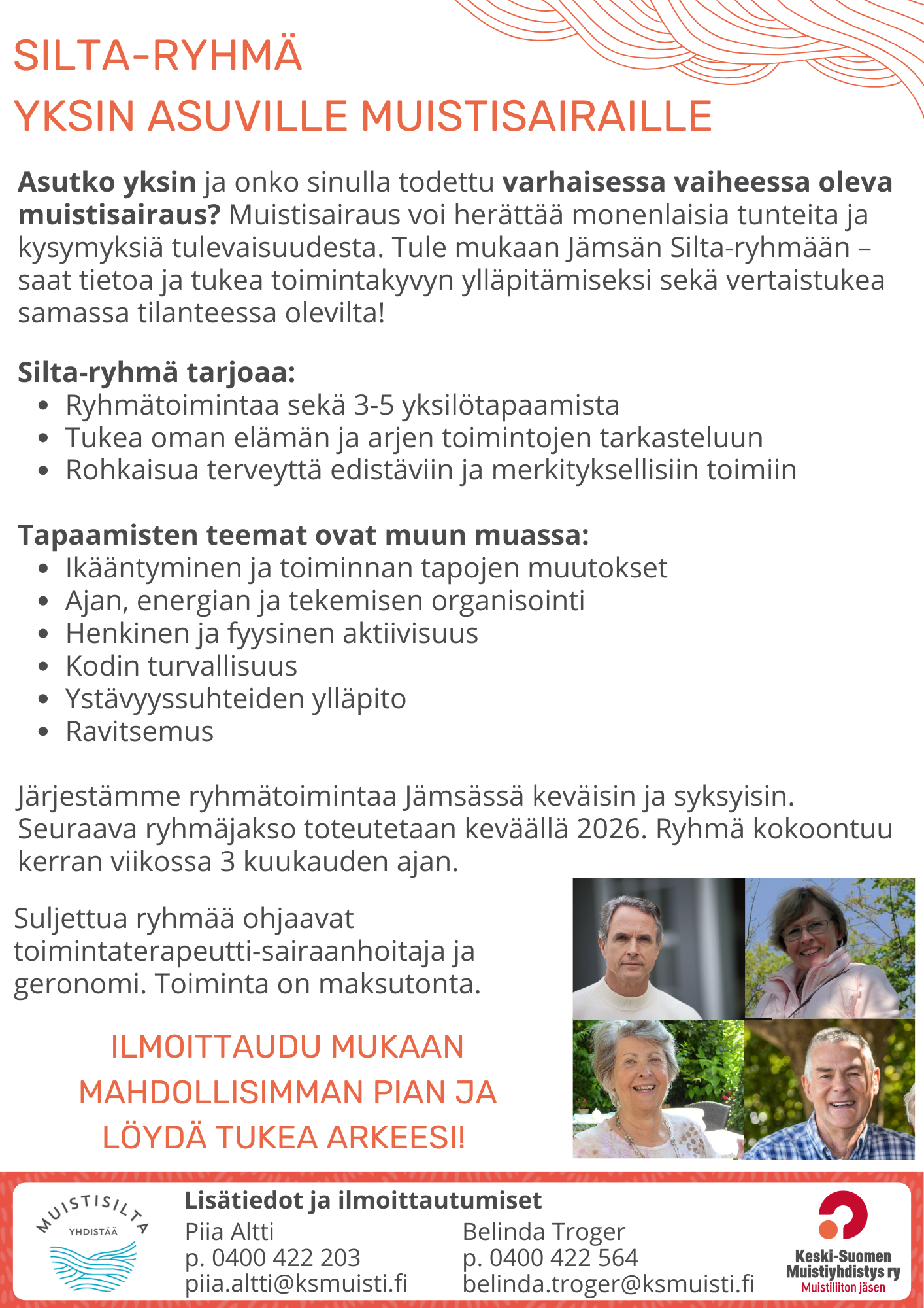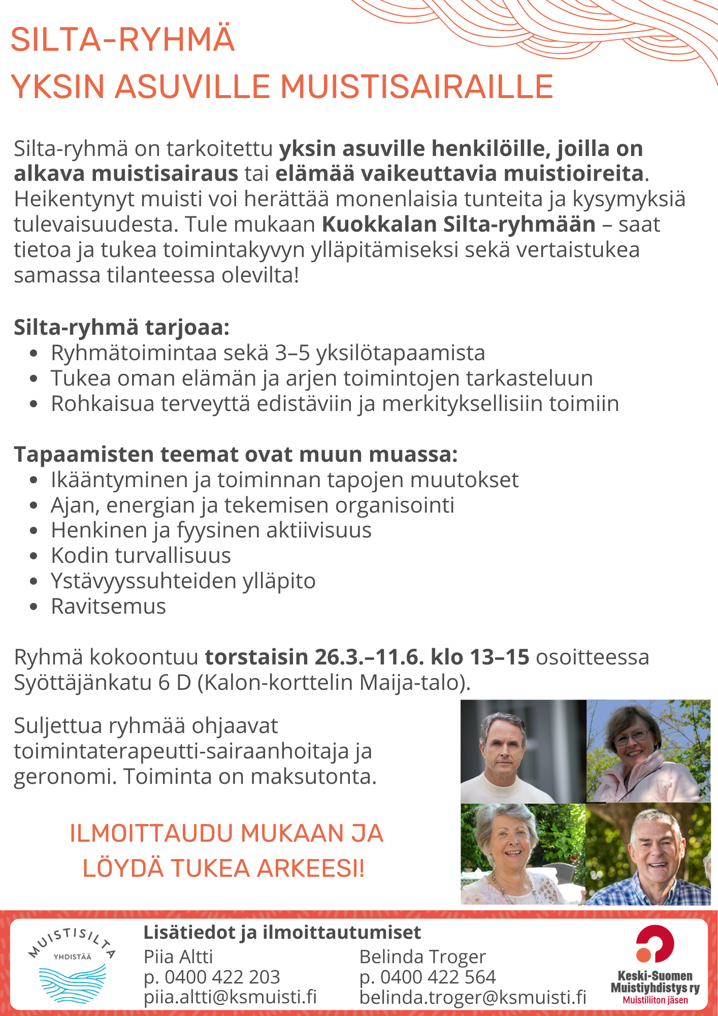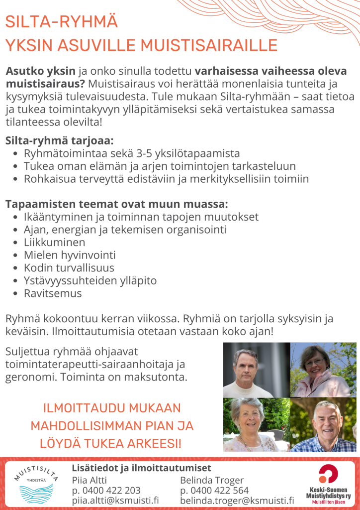 Muistisilta yhdistää -hankkeen ryhmätoimintaan ovat tervetulleita yksin asuvat, varhaisen vaiheen muistisairaat ja etäläheiset, jotka eivät ole aiemmin olleet mukana Keski-Suomen Muistiluotsien toiminnassa. Ota yhteyttä ja tule mukaan!