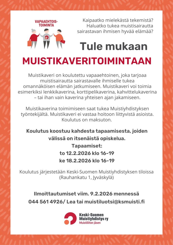 Keväällä 2026 järjestämme vapaaehtoisille muistikaverikoulutuksen. Koulutus koostuu kahdesta koulutusiltapäivästä, jotka järjestetään torstaina 12.2. klo 16–19 ja keskiviikkona 18.2. klo 16–19 Jyväskylässä yhdistyksen tiloissa (Rauhankatu 1). Ilmoittautuminen ja lisätiedot: Lea, p. 044 561 4926